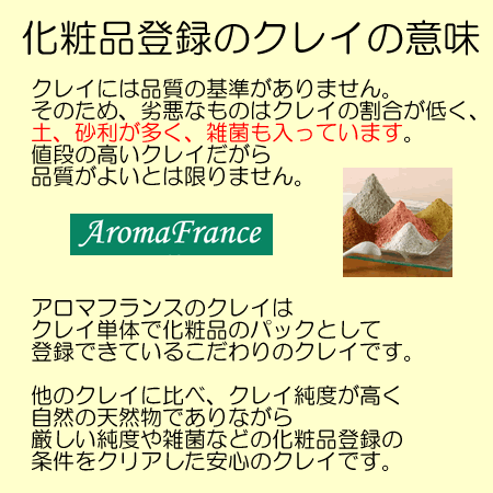 アロマフランスのクレイはクレイ単体で化粧品のパックとして 登録できているこだわりのクレイです。